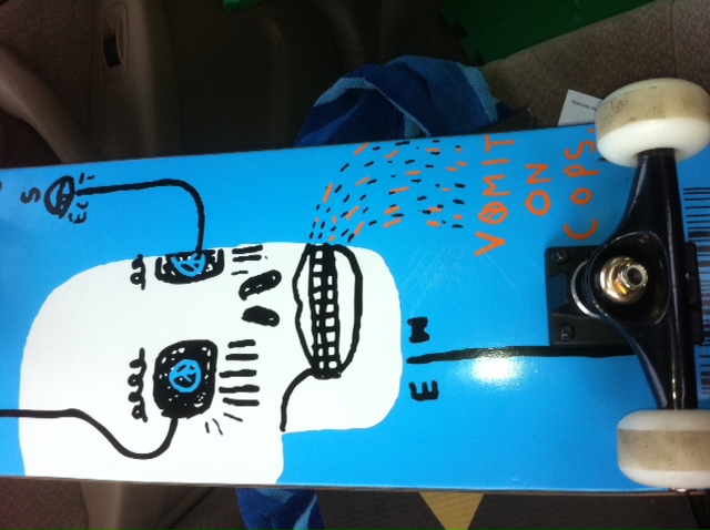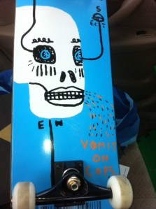 Yo. I just went to Endless Grind with my friends Jeff and Nathan. I bought my first skateboard in like ten years. Its a Black Label deck with some awesome art by Chet Childress who is from the NC. Represent. I’m ready to have some fun! Big ups to Subhan for helping me get what a big boy needs to skate in this day and age. Please wish me luck on not breaking any old man bones. Its cool ’cause now Jeff, Nathan, and I all have new boards and can safely skate together and not feel as intimidated by the teenagers we run into at the park. I hope I can remember how to do it. wer dup