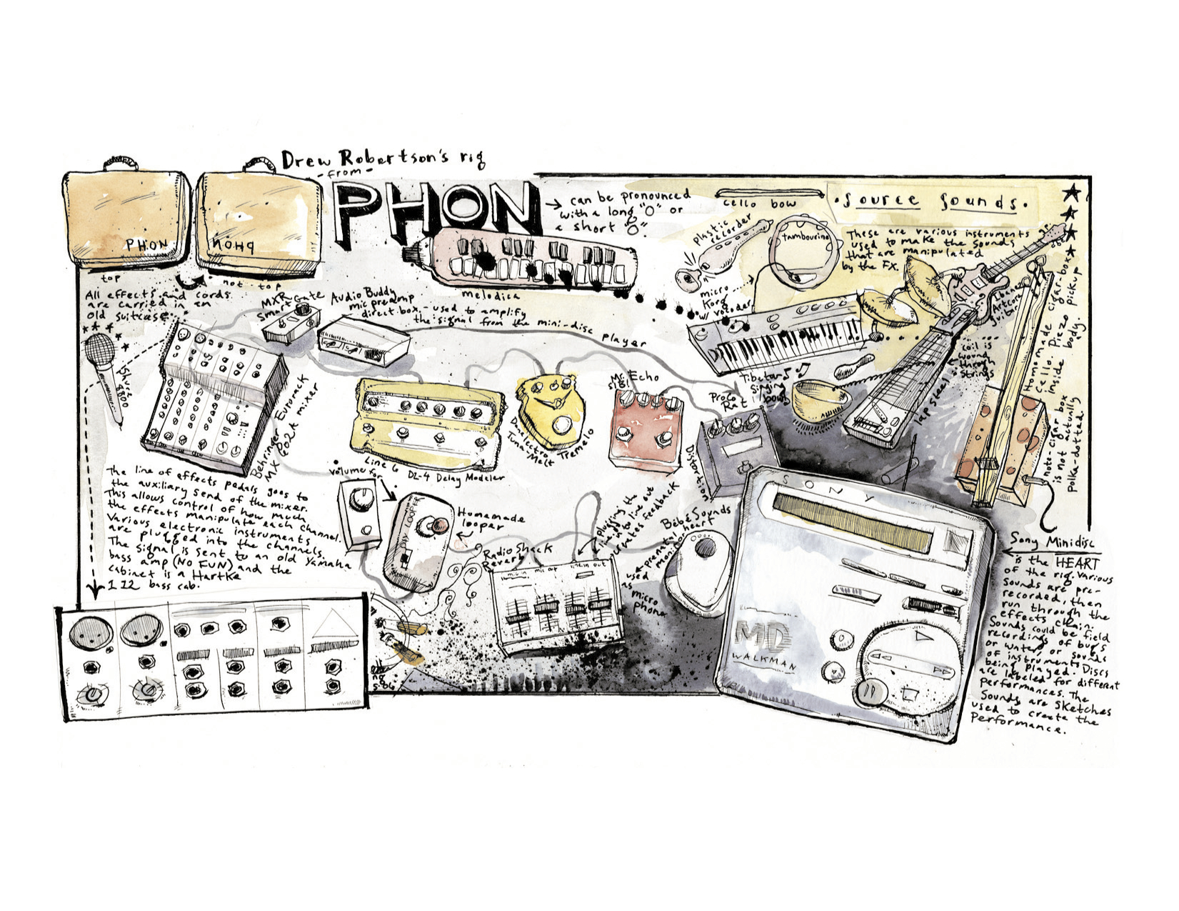So I was doing some file management on my laptop today, and I came across a bunch of Phon stuff. I miss me some Dustin. Don’t worry though, even with distance we are still going to make Phon happen. Anyway, I came across this illustration by Nathan Golub. It is an awesome drawing and shows my rig from 2006. Things are a lot different now. The illustration was for an article that appeared in the Indy. It was a round table discussion conducted by Brian Howe, and it featured local noise makers, Crowmeat Bob, Ryan Martin, Zeke Graves, Jeff Rehnlund, Anne Gomez, Robert Biggers, and myself. It makes for a fun read, but I can say that I should have spoken less.