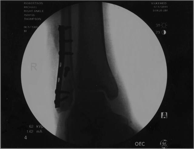okay so this weekend was pretty intense. nathan and jeff and I went skating. i used to skate all time, now im completely out of practice. Before we hit the half-pipe we went to Vertical Urge and bougth every pad we deemed necessary: helmet, elbow pads, kneed pads, even wrist guards. well anyway none of us are experts on dropping in on the half-pipe so we’re egging each other on about who would do it first. eventually someone had to try it. i made three attempts. the first one i didnt lean forward at all and as a result fell back. the second time I was almost there. then the third attempt. on this try i dropped in and chickenfooted. i tried to catch myself but i tripped over my own ankle. anyway i dislocated my foot and broke some ankle bones. it blew. jeff and nathan took me to the emergency room. they hung out there for a few hours and then my girlfriend and parents came to take care of me. the next day my parents came and they brought me back to Charlotte. Being back in Charlotte is weird. anyway, the pics above are of the two titanium plates and screws they used to restructure my ankle. its weird i have a cast, im using crutches (which sucks), and i dont know if you can tell by my writing but they also gave me some pretty strong painkillers.